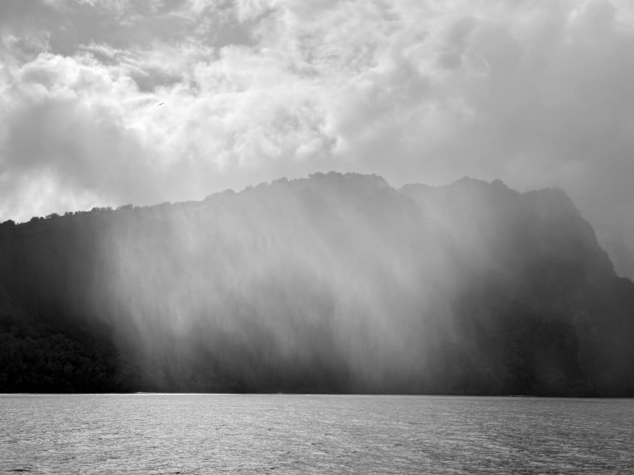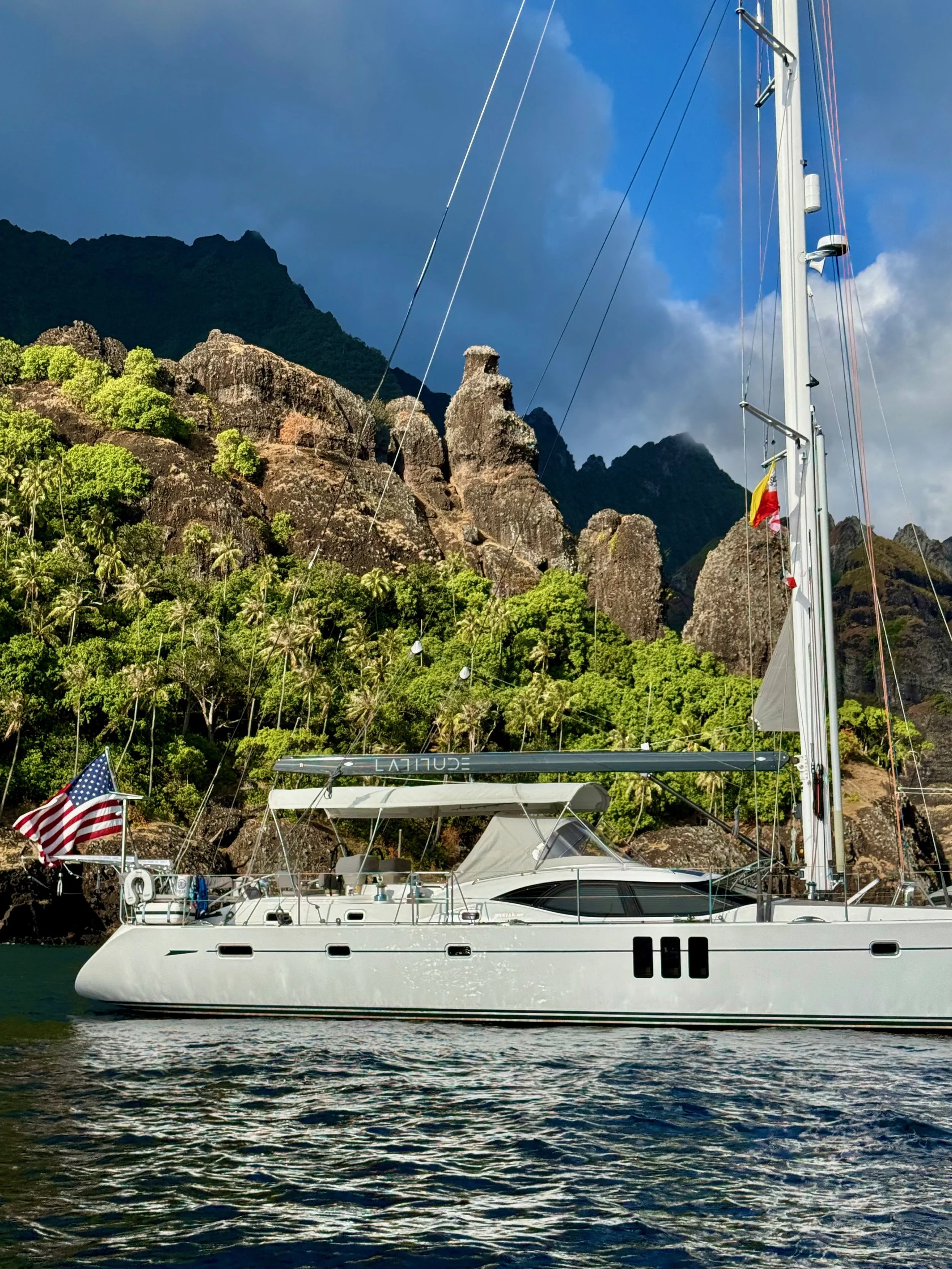 Feeling bolstered but regretful, we sailed out of Hanavave Bay this morning as rain clouds climbed over the sheer cliffs and enveloped the Bay in a concealing shroud of mist. Fatu Hiva’s magical doors were closing.