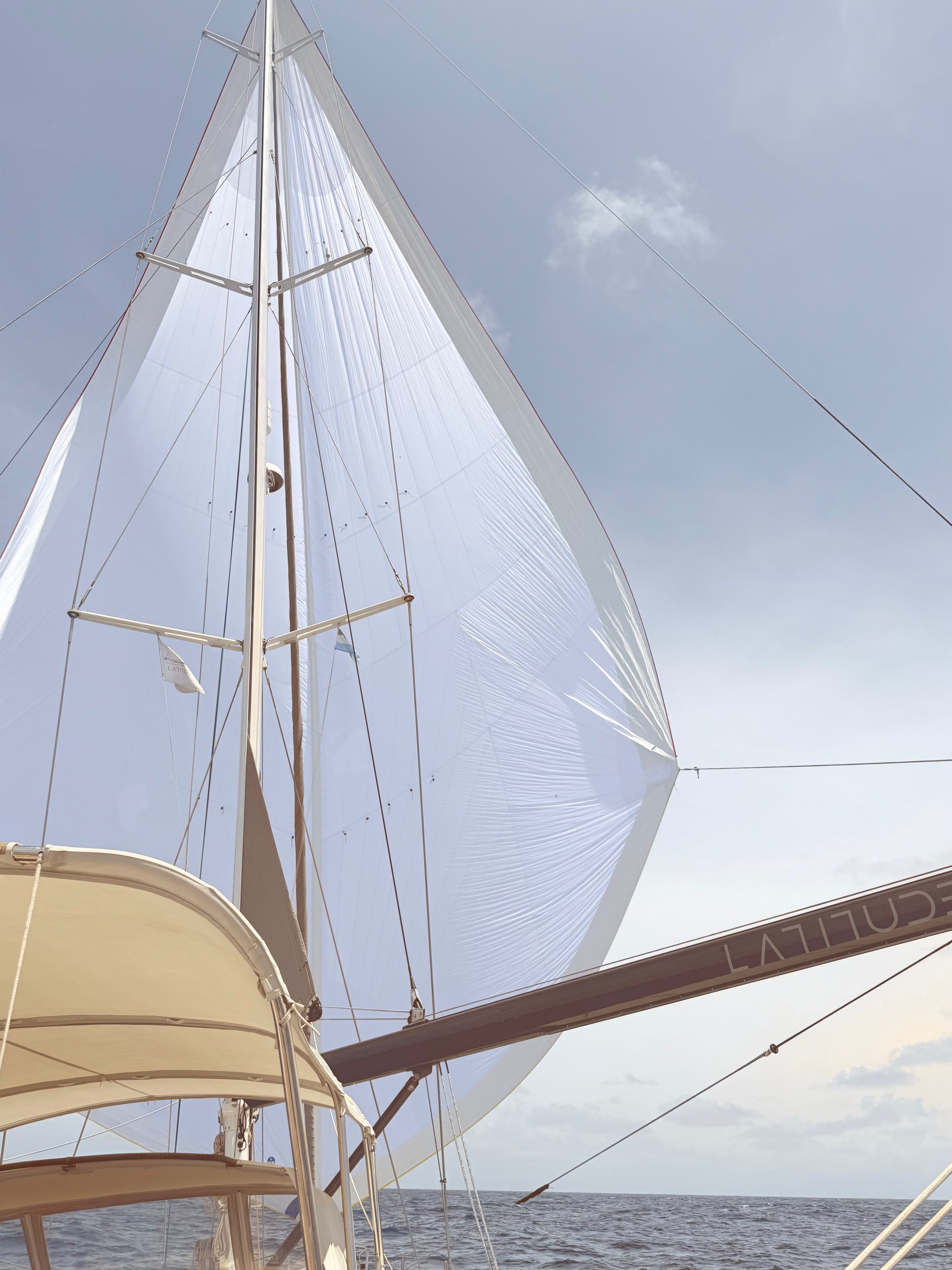 Both the favorable trade winds and the steady, benign weather are gifts given to us by The Coriolis Effect. Here I will try to explain. The earth is a large spinning ball but the speed it spins is not the same everywhere. At the “fat” part on the equator it moves about 1,000 miles an hour but at the poles it is hardly spinning at all. So if you could throw a paper airplane due south from the north pole straight to the equator, the airplane would land way to the right because the earth is spinning increasingly fast underneath it. This is why weather systems spin. High pressure wants to rush to low pressure but it can’t rush in a straight line because of the Coriolis effect. Hence, weather systems and hurricanes in the Northern hemisphere spin counter-clockwise and weather and cyclones spin clockwise in the Southern hemisphere.